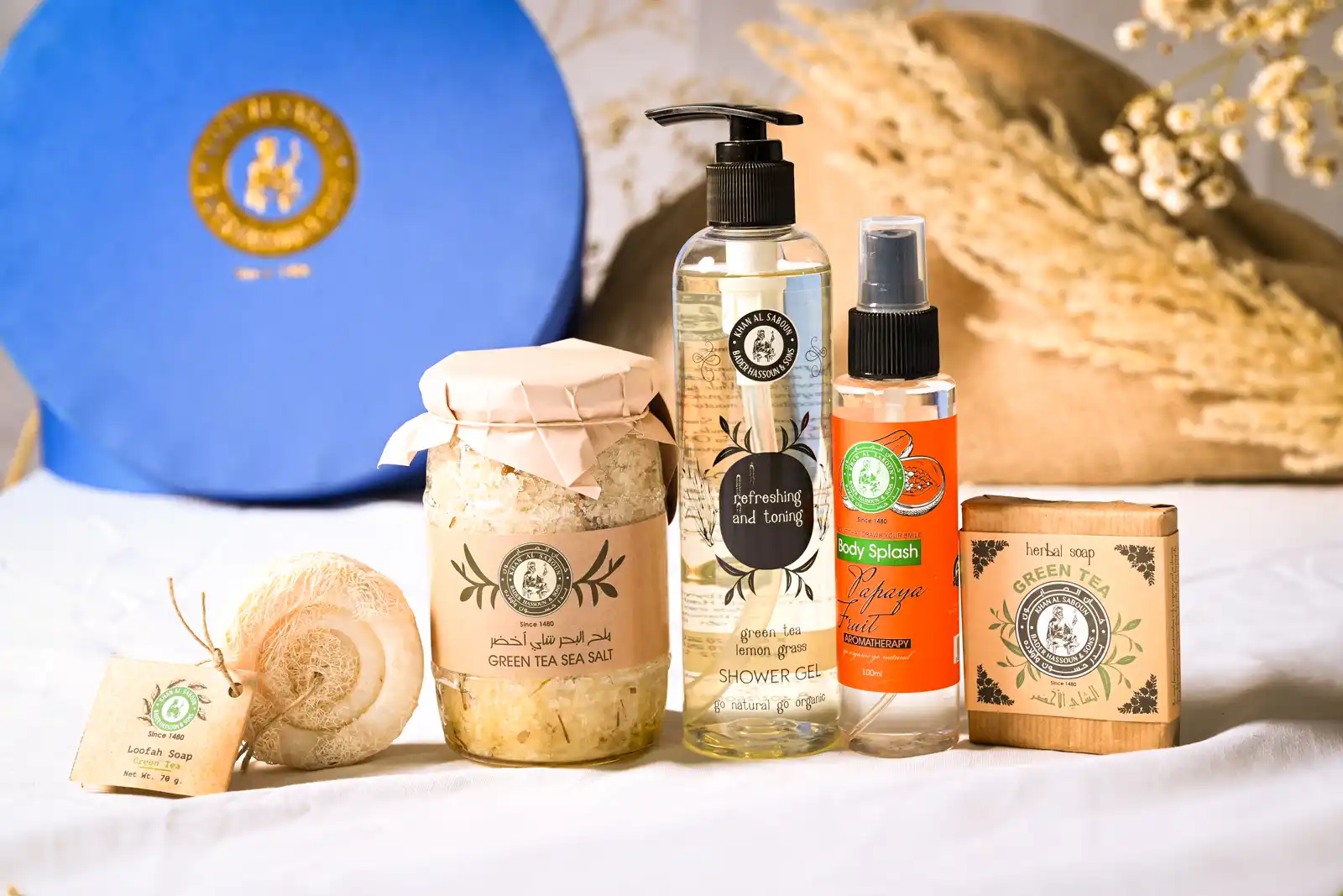 صندوق دائري كبير باللون الأزرق يجمع بين الفخامة والانتعاش، مثالي كهديّة تعبّر عن الذوق الرفيع والعناية الطبيعية الراقية من خان الصابون.